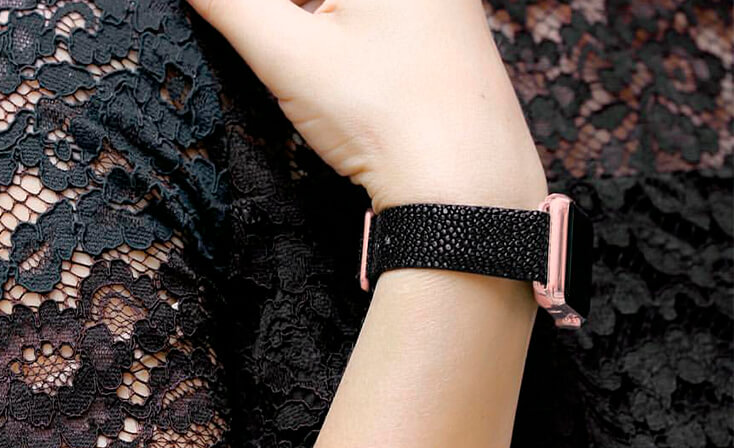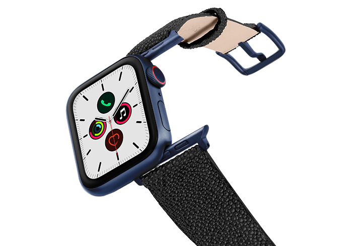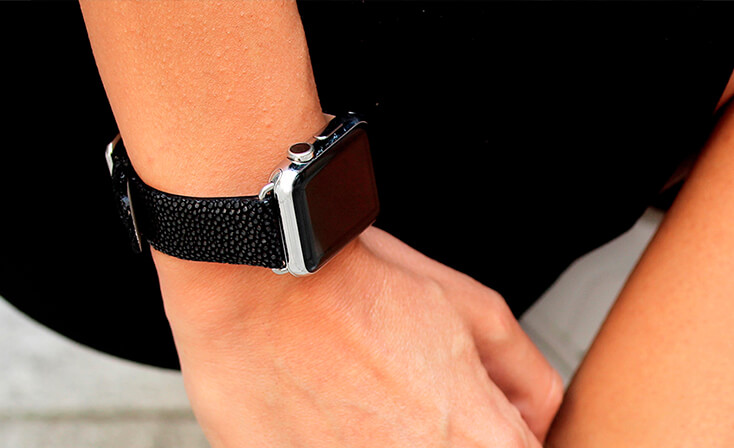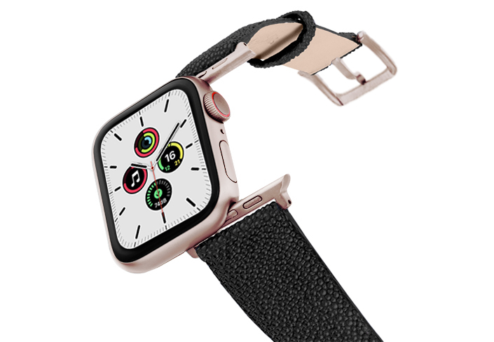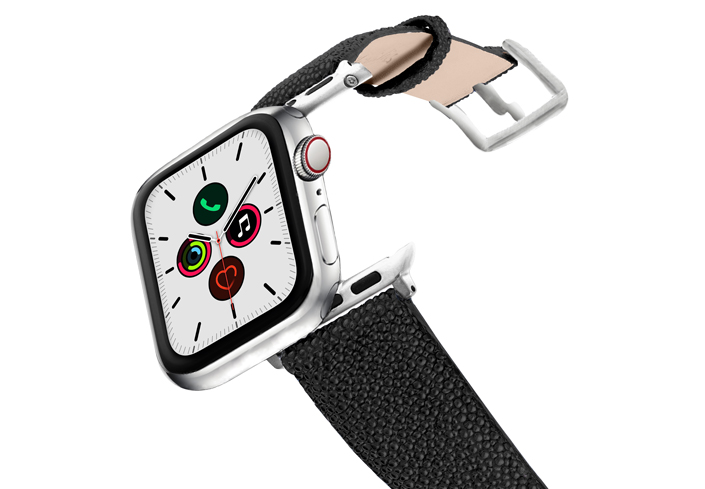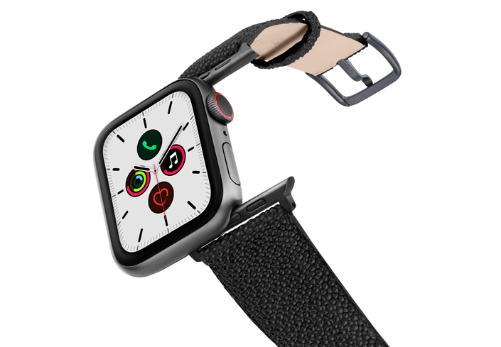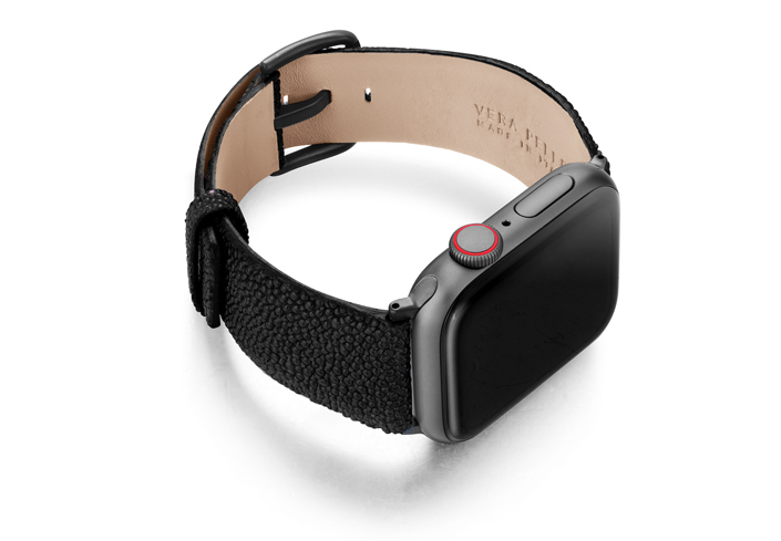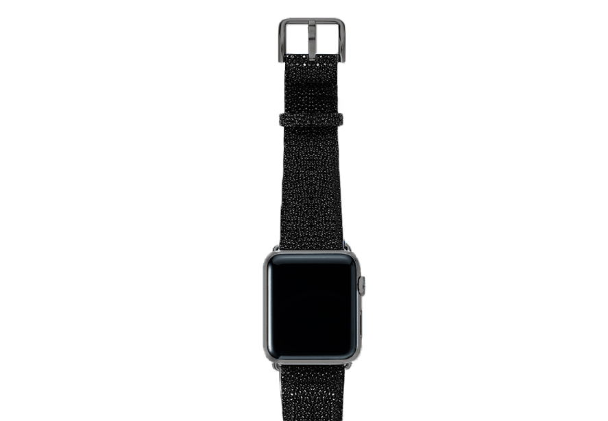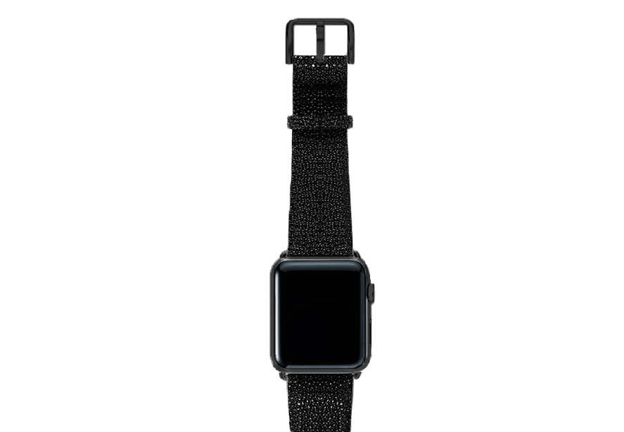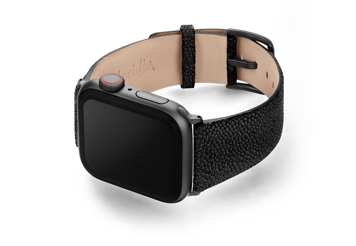 Dark Secret, il cinturino in pelle galuchat di Meridio, è nero lucido e perlato per donare un’eleganza senza tempo al tuo Apple Watch Series 6 & SE 5|4|3|2|1. Disponibile con casse 38 | 40 mm e 42-44 mm