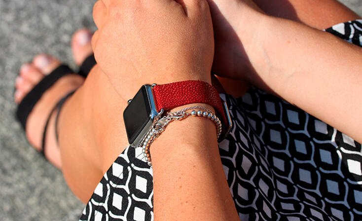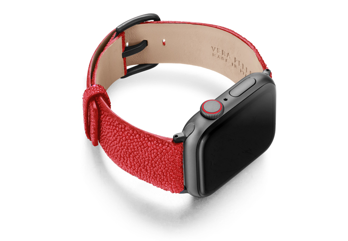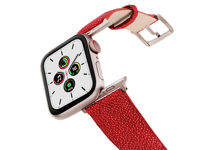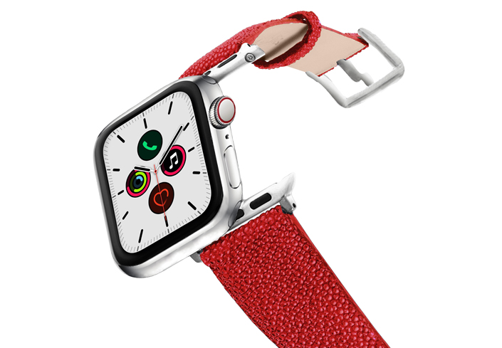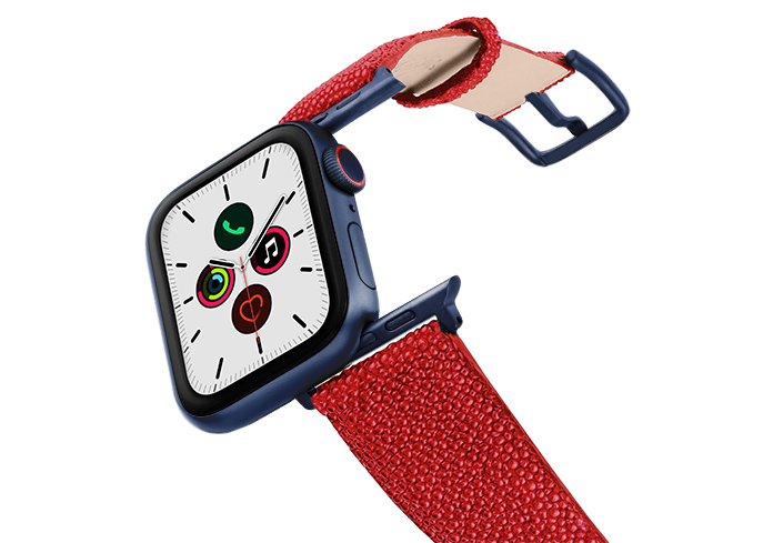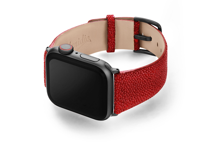 Maldives, il cinturino per Apple Watch Series 5 e 4|3|2|1 realizzato da Meridio in pelle galuchat, è esotico come il riflesso della barriera corallina. Disponibile per casse 38-40 mm e 42-44mm