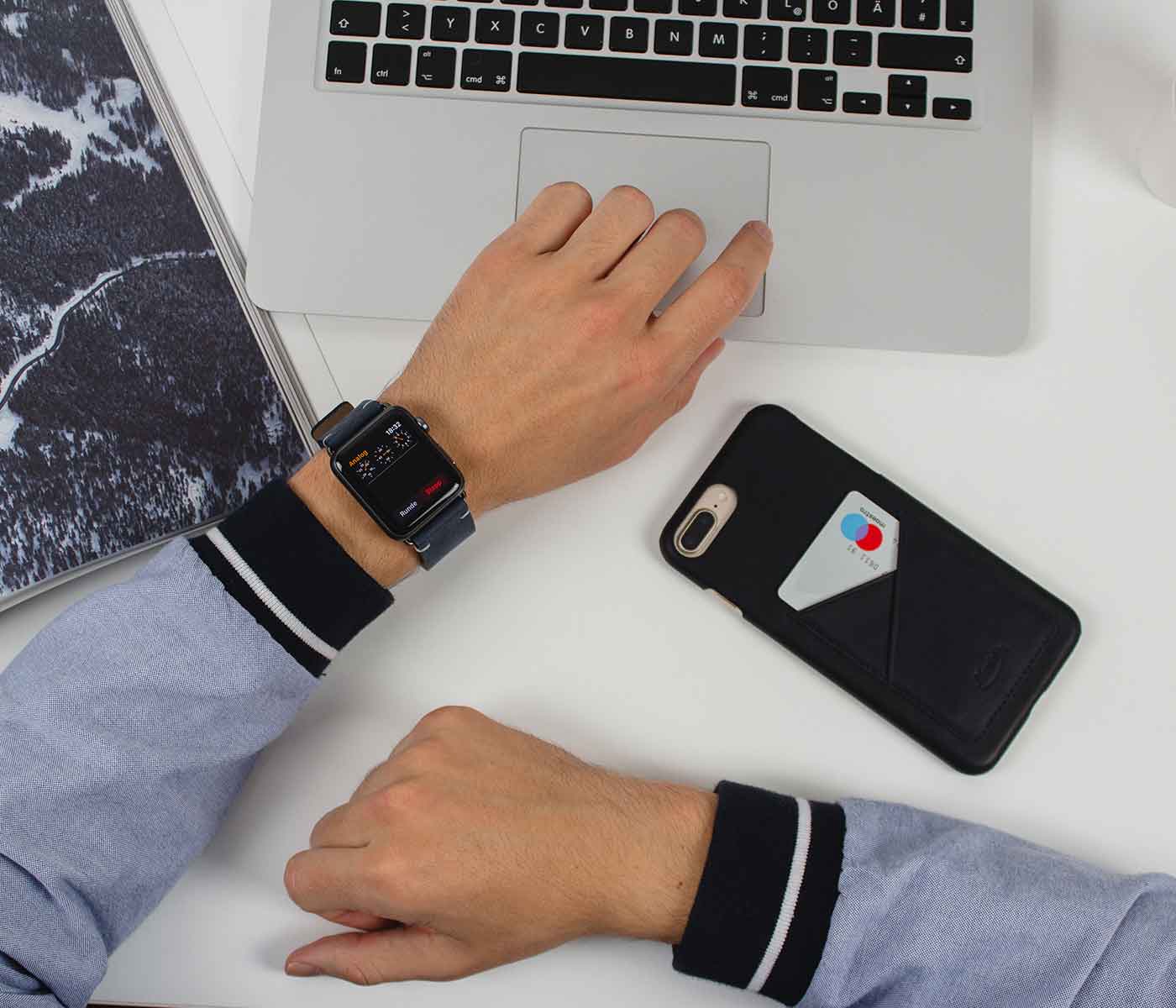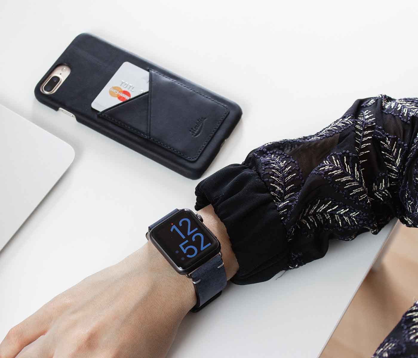 Elegance and simplicity distinguish this composition whose color is inspired to the arctic nights and the deep blue of the universe. The leather is pleasant and soft to the touch and this gift is suitable for him who loves to have a sophisticated and professional look. A leather iPhone case with a comfortable external pocket and intense color, and an apple watch strap in calfskin for series 5 and previous. It is suitable an AW case size 42-44 mm