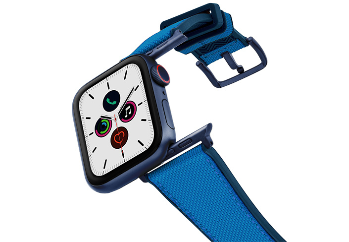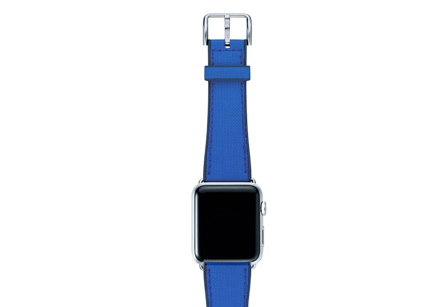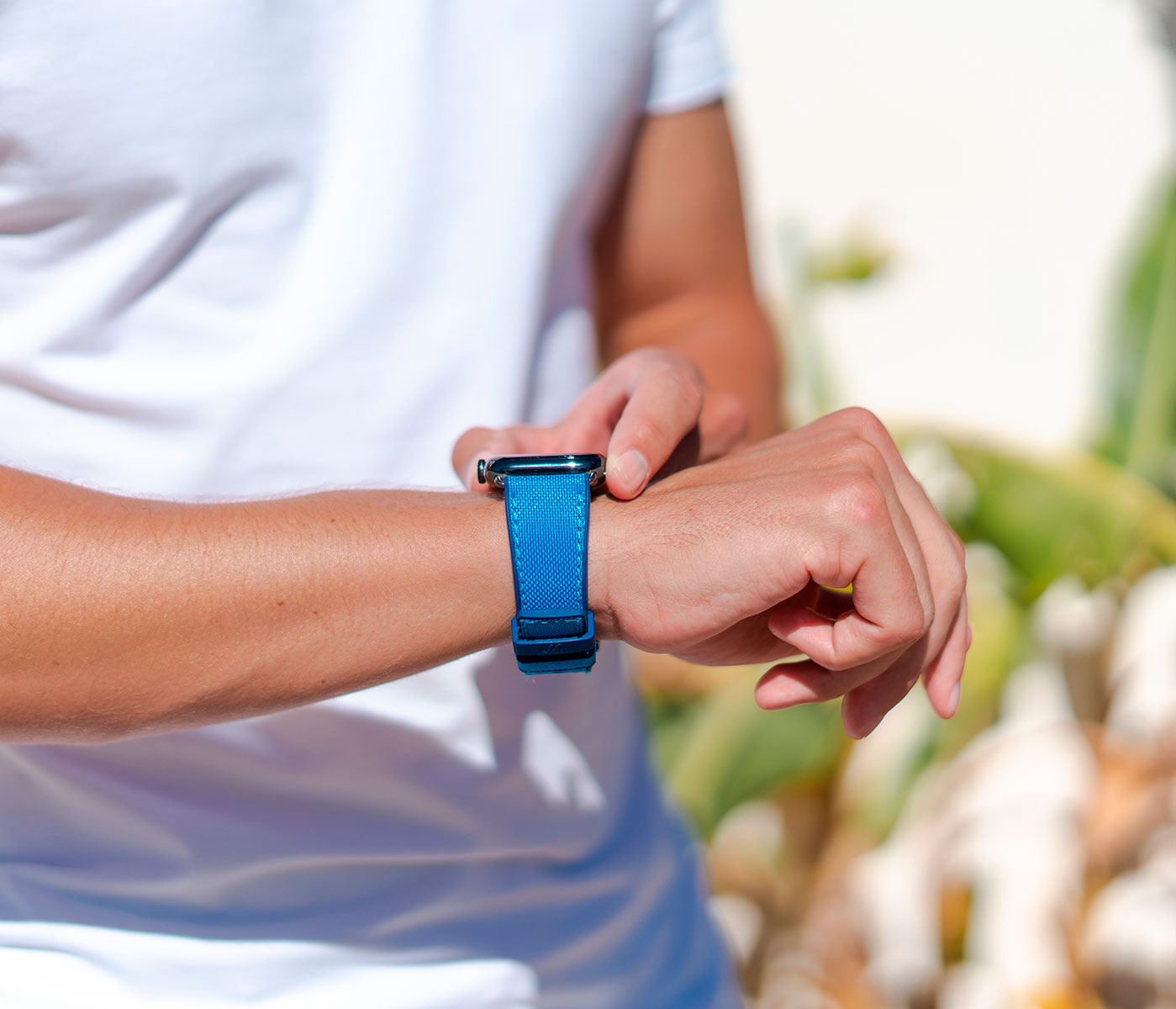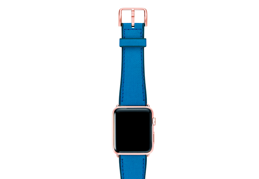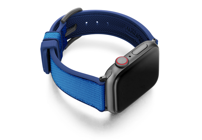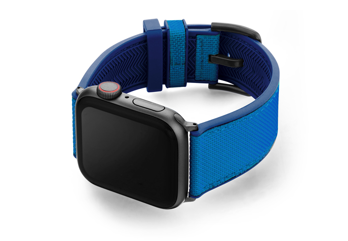 The vibrant and fervid blue of the fish of the crystalline tropical seas. A fresh, bubbly tone for an extremely versatile Apple Watch to be sporty and elegant at the same time: a quality yarn product made with a cutting-edge materials, such as natural rubber  (caoutchouc), that make it water resistant. The colored cotton stitching, handmade in Italy, is the detail that makes the Meridio band one of a kind. Those straps are 100% waterproof, covered in polyester on top with an exclusive pattern on back. For Apple watch series 5 and 4|3|2|1. It fits only 42-44mm