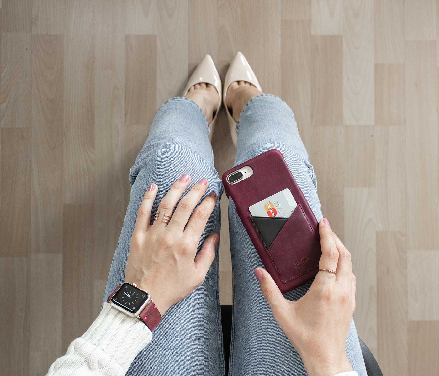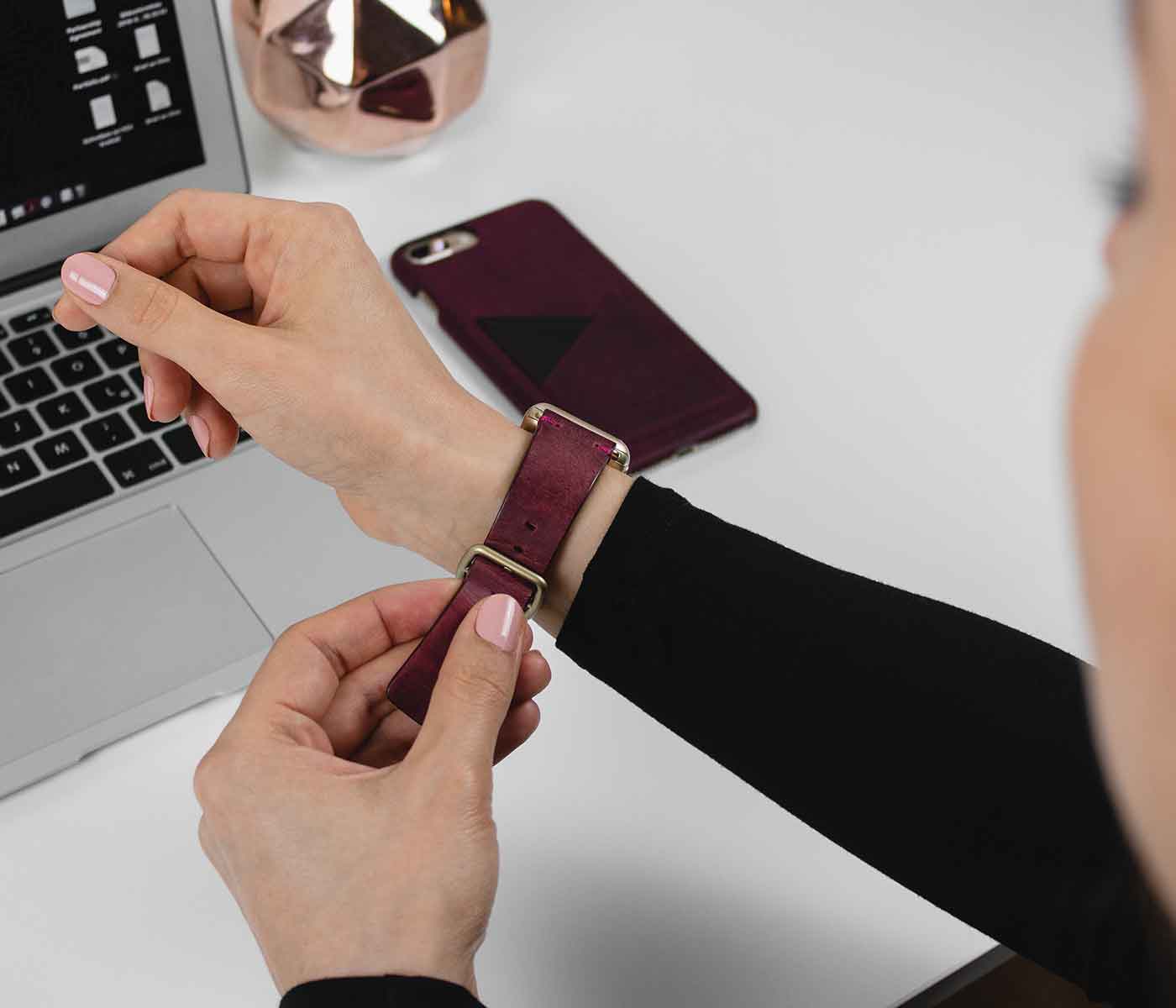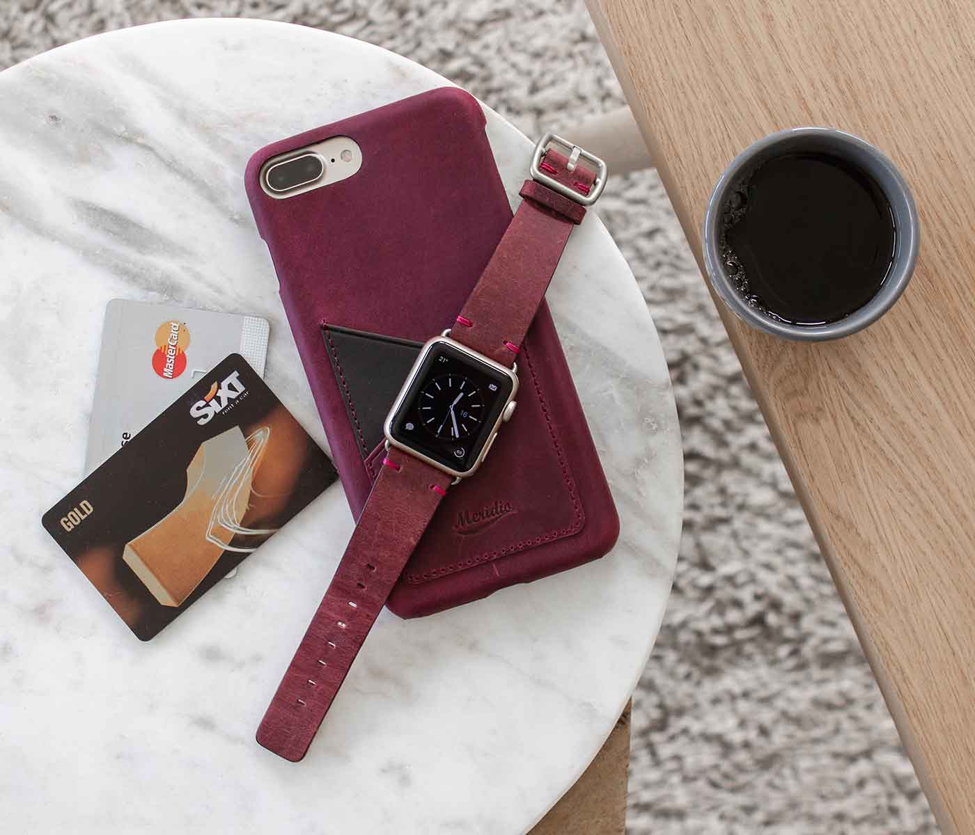 Red: the protagonist of this combination for a truly romantic and passionate gift idea for her. The skin of the apple watch strap soft and expertly hand carved according to the made in Italy tradition, and the intense color of the Iphone cover with external pocket, are the ideal option for a woman with an unconventional style.