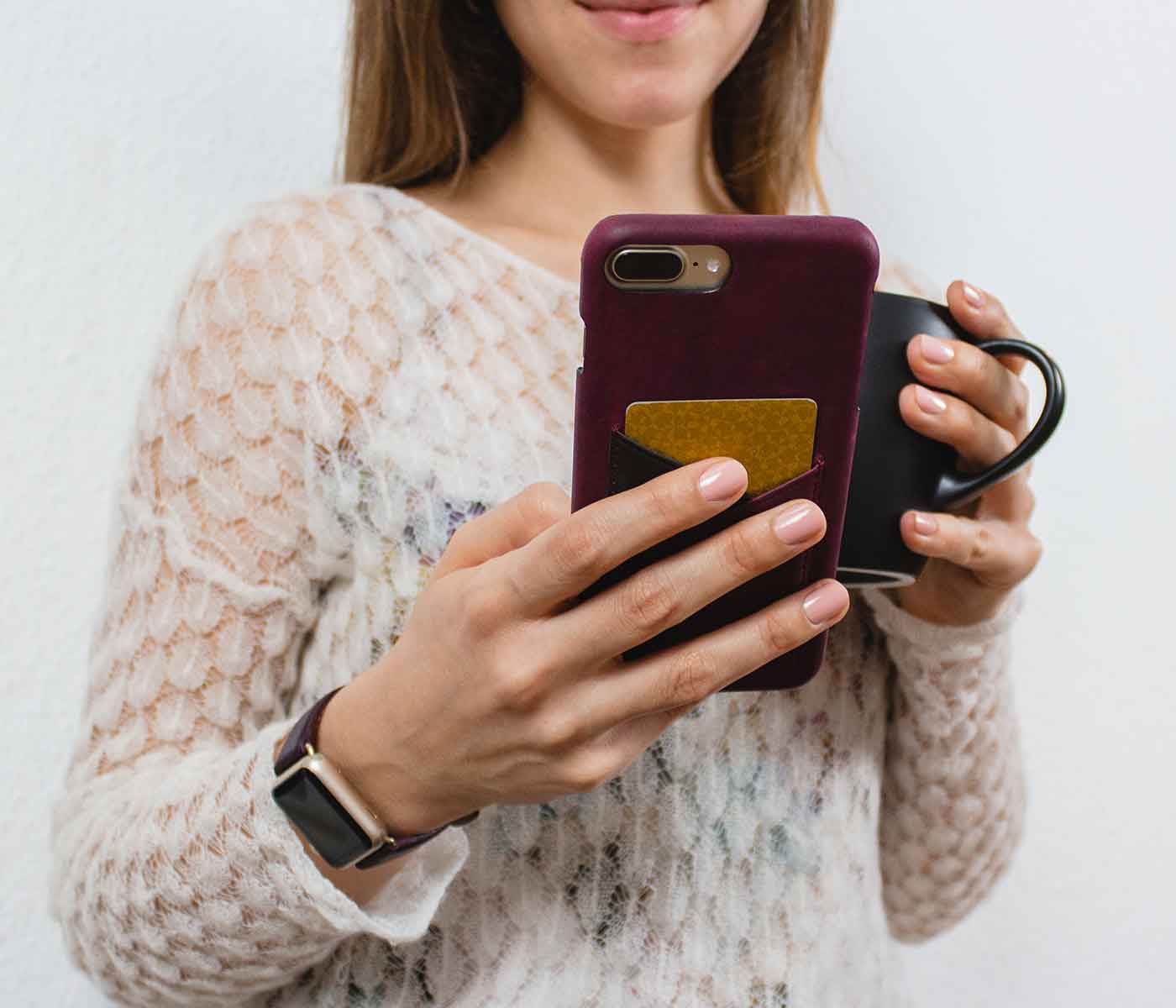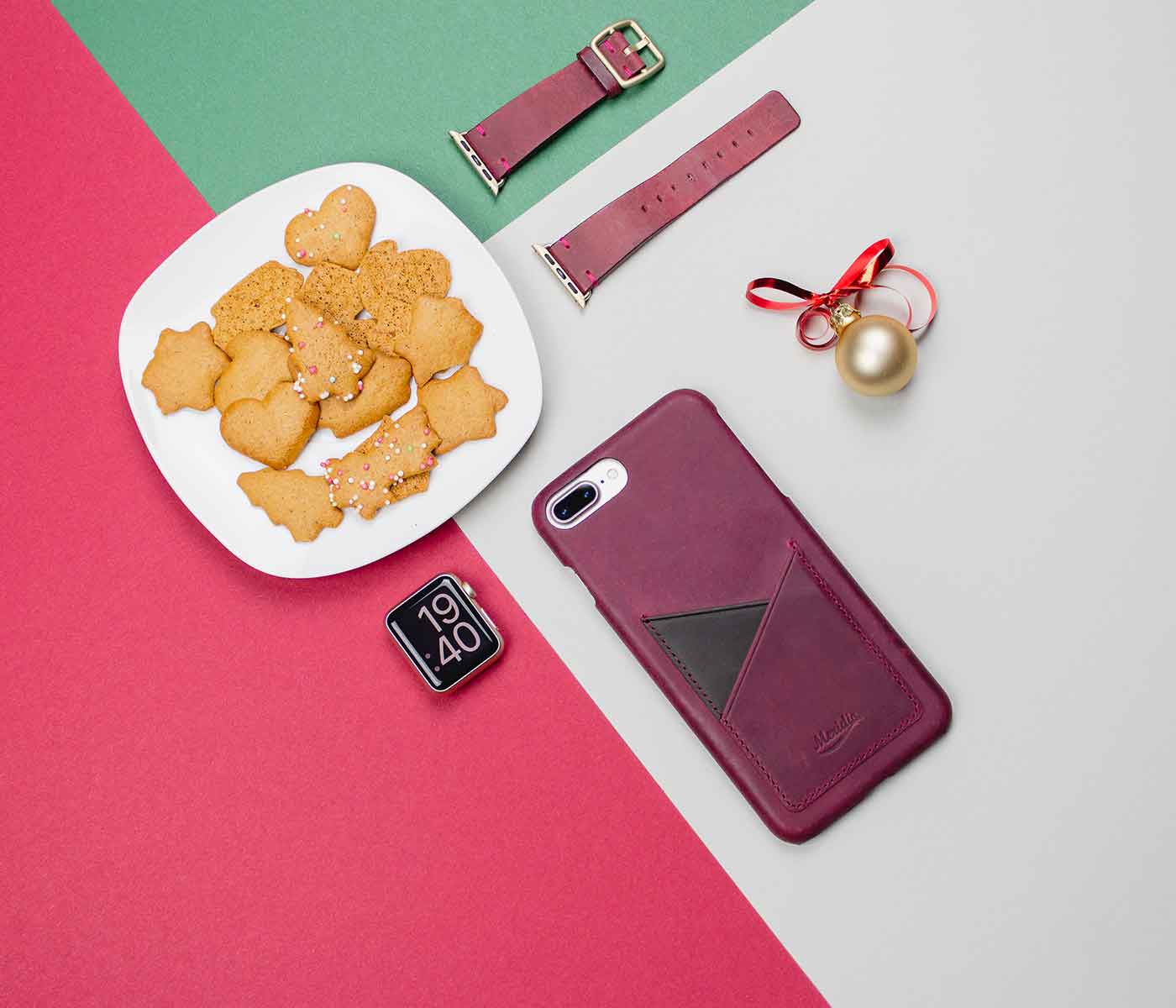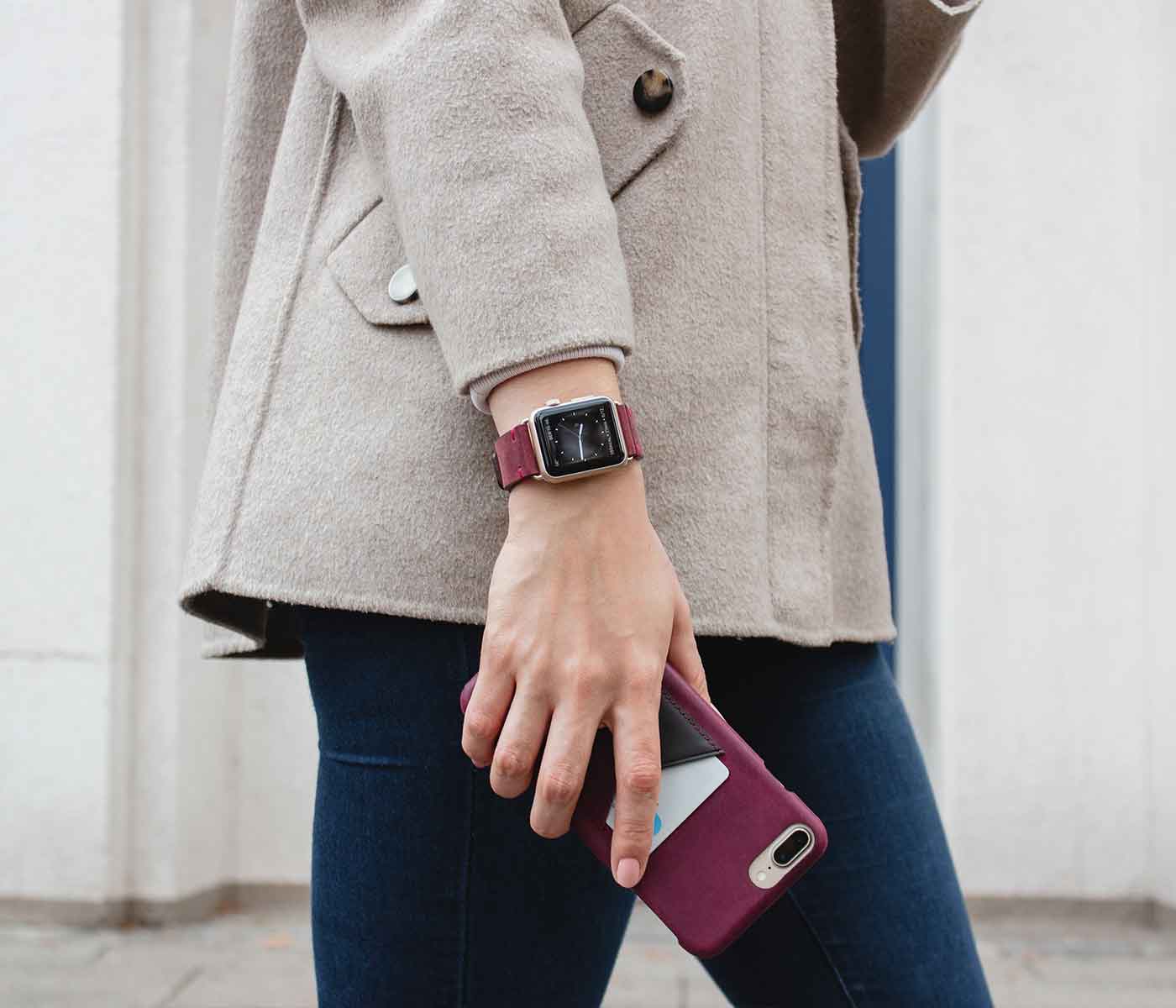 Red: the protagonist of this combination for a truly romantic and passionate gift idea for her. The skin of the apple watch strap soft and expertly hand carved according to the made in Italy tradition, and the intense color of the Iphone cover with external pocket, are the ideal option for a woman with an unconventional style.