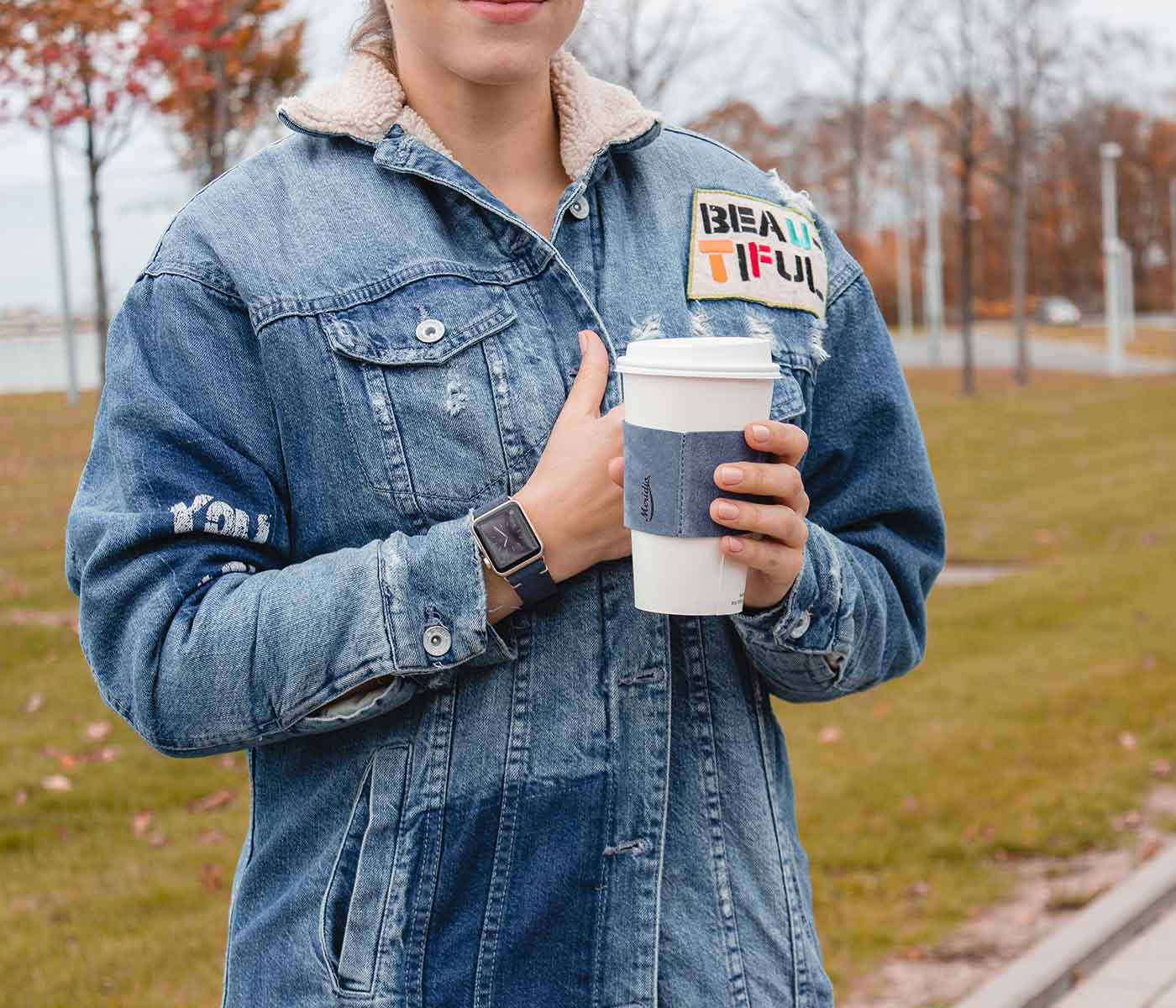 The deep-toned blue characterizes this composition made of a leather strap for apple watch from the Suede collection and the suede cups holder in warm and elegant blue. A perfect combination as a Christmas present for elegant women who wink at casual and sporty clothes